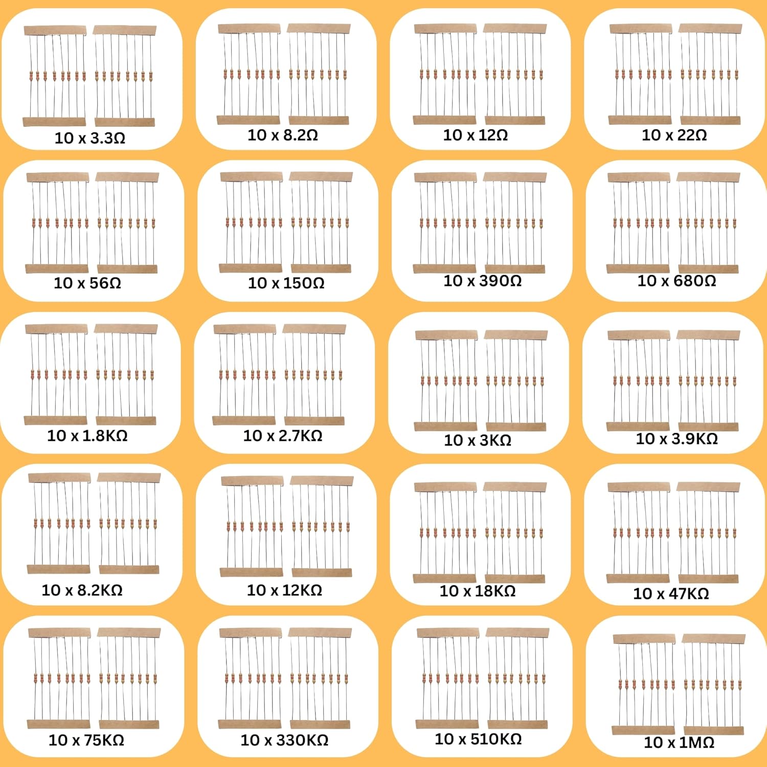 - Resistors: 200-piece assortment of 1/4W carbon film resistors with values from 1 ohm to 1M ohm.