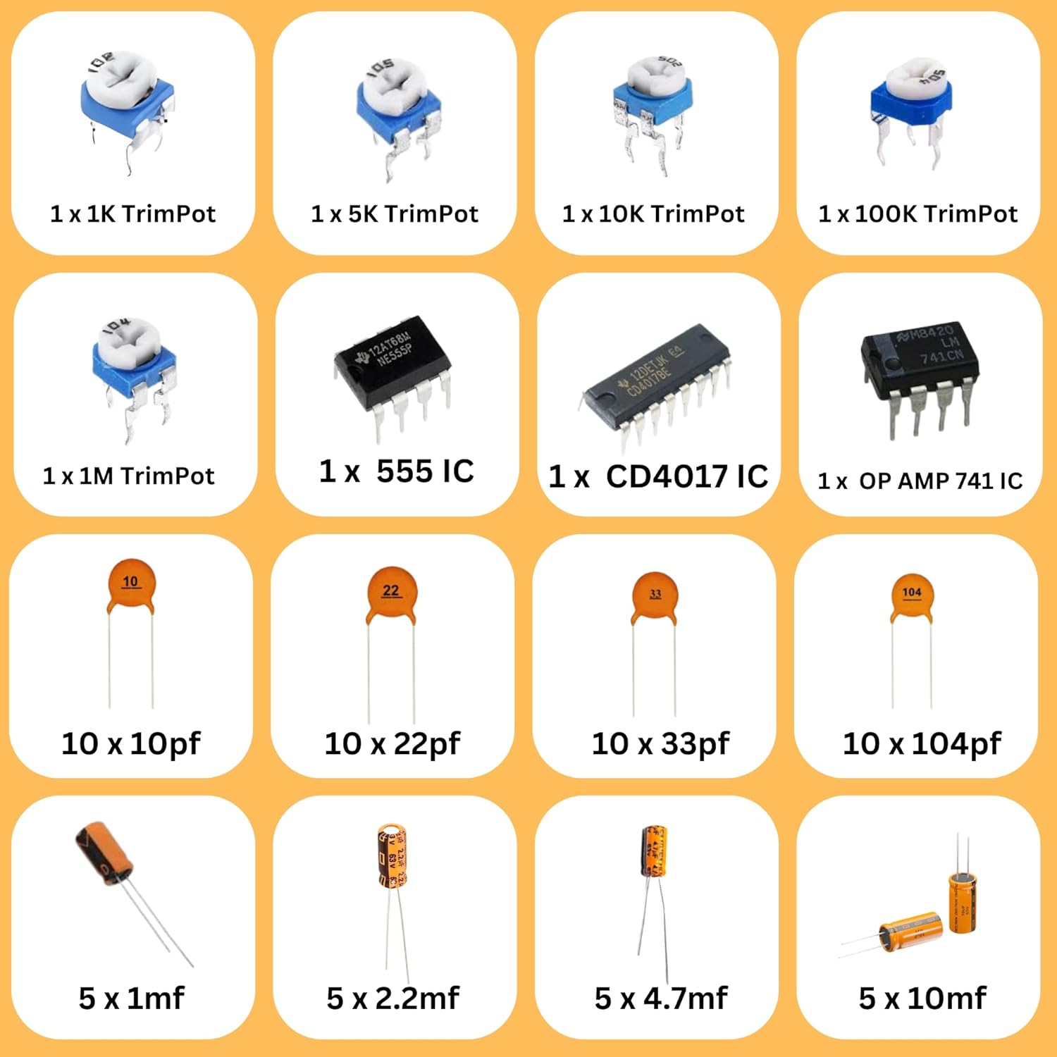 - This electronic kit can be used in various electronic projects or you can learn electronics with these components