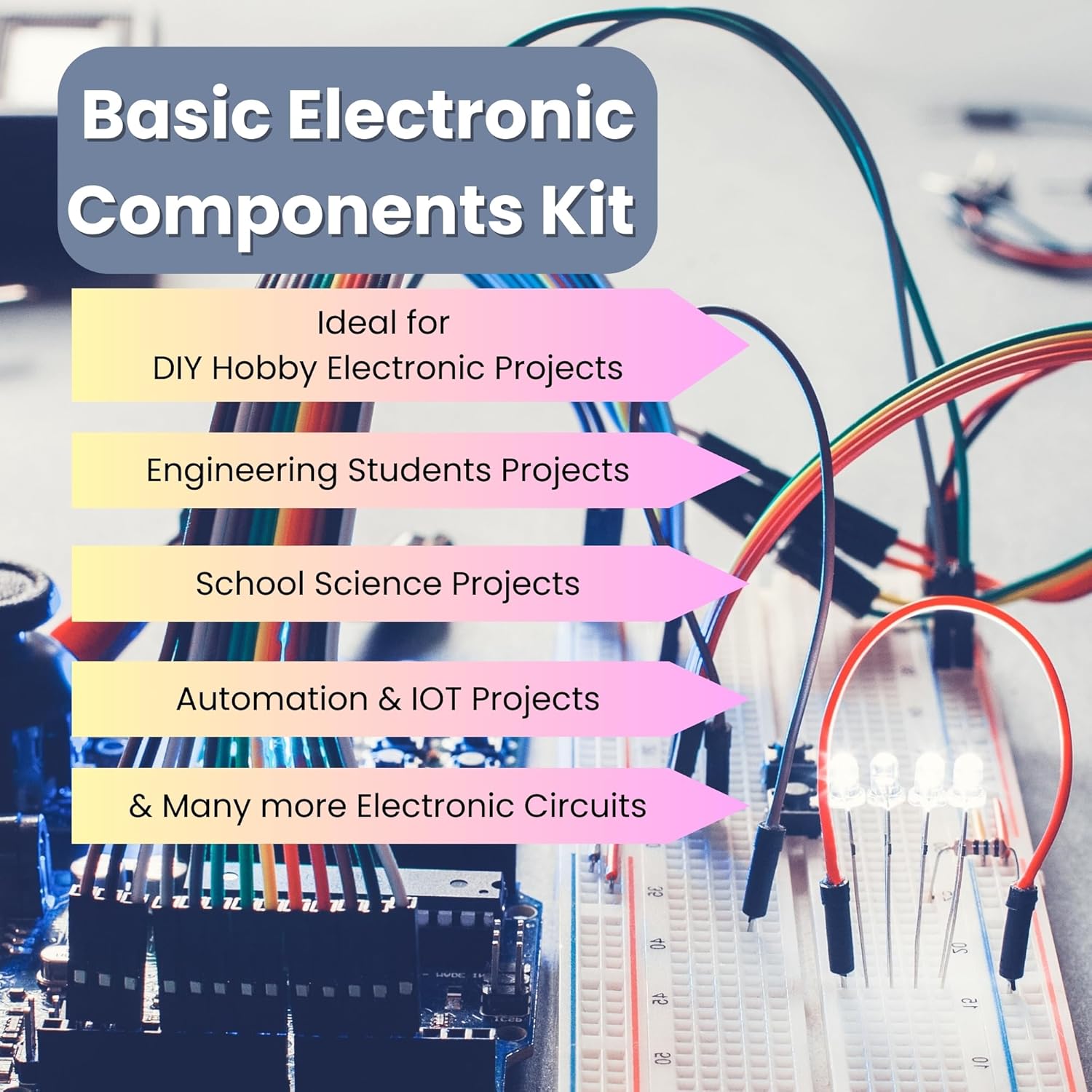 - This basic electronic components kit includes more than 350+ components including breadboard, resistors, capacitors, and transistors kit.